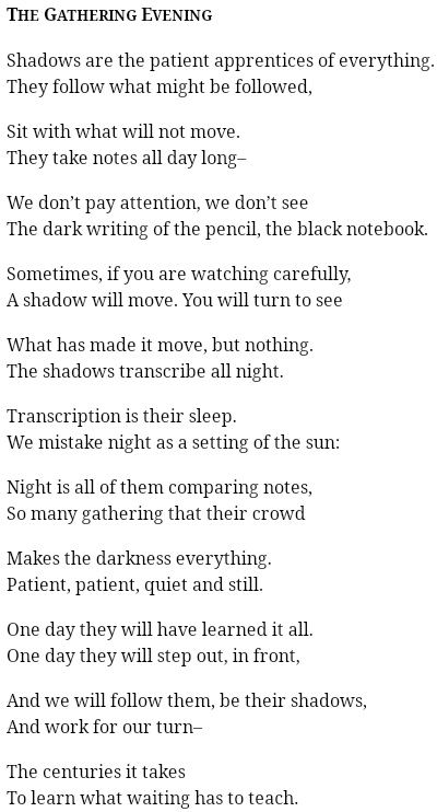 In the first stanza, “Shadows are the patient apprentices of everything.” The shadow is regulated into the shadows as helpers or assistants, “patient apprentices”. The shadow both personifies and symbolizes the immigrant's invisibility. We see this continue in the third stanza, “We don’t pay attention, we don’t see The dark writing of the pencil, the black notebook.” We see the same motif of darkness invisibility. Where what they're taking note of and learning is shrouded in mystery. Something that the audience doesn’t see. This pronoun “we” continues to show up. We, the audience and the speaker, don't see the sacrifices happening behind the scenes. Additionally, in the seventh stanza, “Night is all of them comparing notes, So many gathering that their crowd”. This stanza reminds me of night classes, adult learning classes, maybe even English as a second language class. This is quiet self-improvement happening, in real-time. At night, where they are surrounded only by their peers. People who also understand and are going through the same immigrant struggle. In the ninth stanza, “One day they will have learned it all. One day they will step out, in front,” In this stanza we see, a dramatic tone shifts from meek and quiet to declarative. This is declaring the triumph of the immigrant, over the barriers they’ve faced. In the tenth stanza, “And we will follow them, be their shadows,” This is the speaker relating himself to the struggle and learning from his parents' sacrifices.